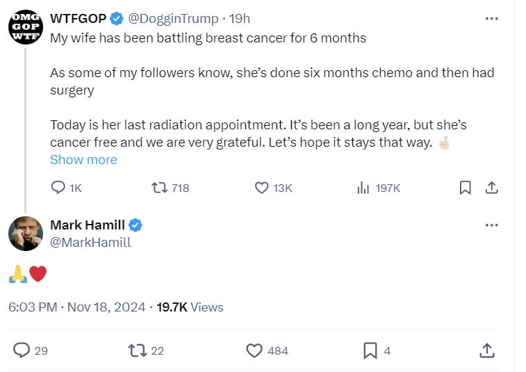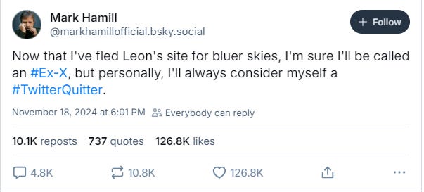 What do you make of Hamill announcing that he left X for Blue Sky and then just two minutes later posting on X? Become a paid member to leave a comment and let us know.