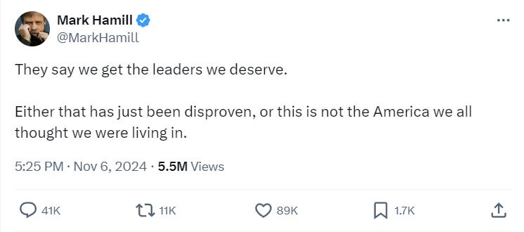 Hamill last posted to X on November 6th the day after the election writing, “They say we get the leaders we deserve. Either that has just been disproven, or this is not the America we all thought we were living in.”