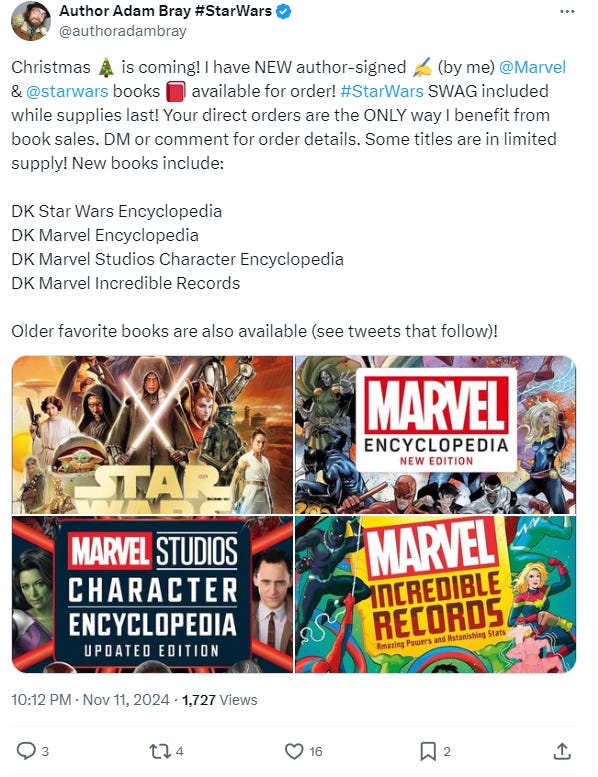 He wrote on X, “Christmas is coming! I have NEW author-signed (by me) Marvel & Star Wars books available for order! Star Wars SWAG included while supplies last!”