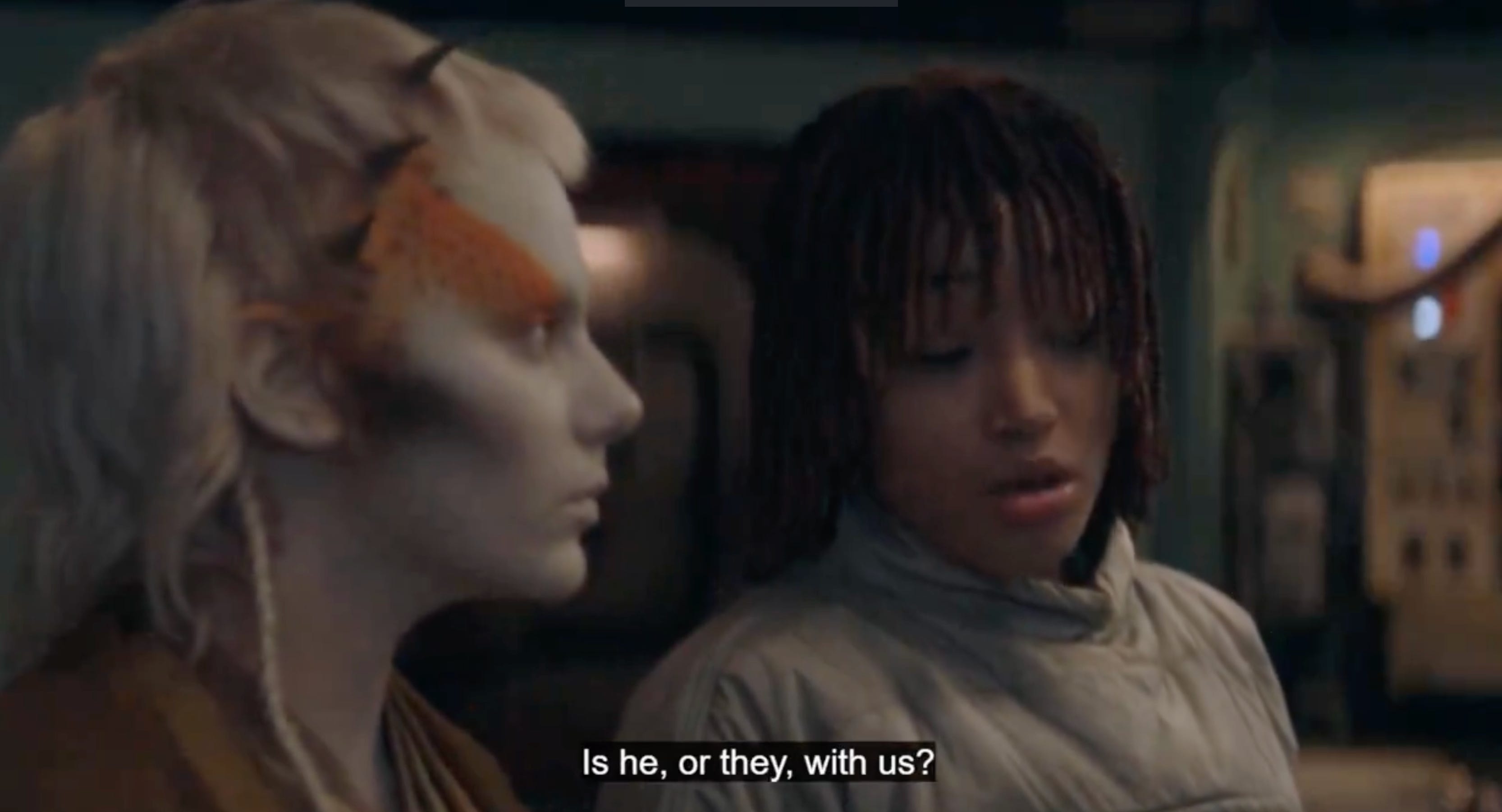 Now, in the fourth episode, Star Wars has introduced pronouns. In a scene where they're introducing a ferret-like alien character as a tracker, the main character asks who he is. Even though the character's on the starship with them on the mission, she asks, "Is he, or they, with us?"