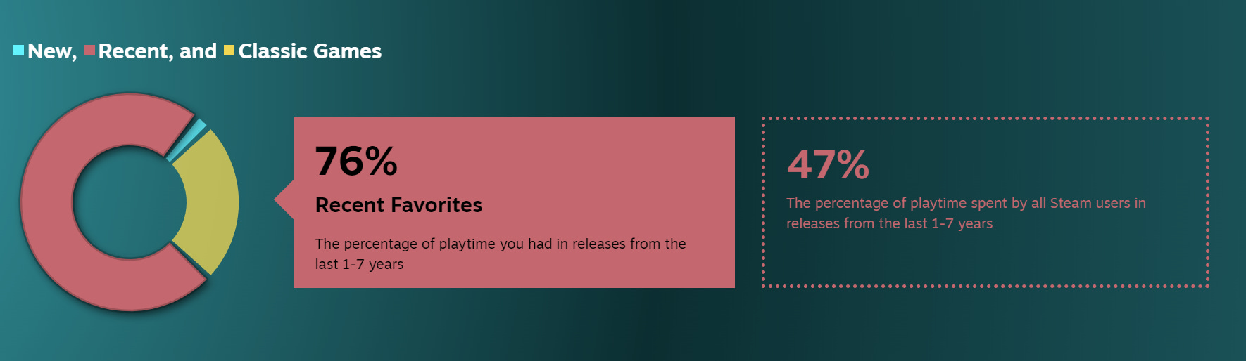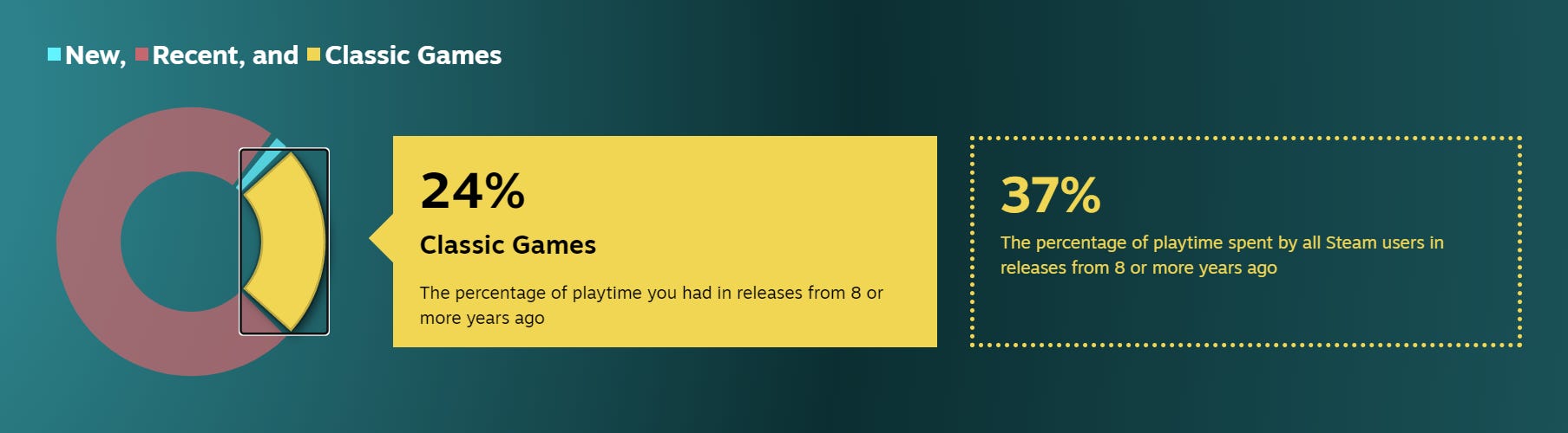 It also compares your data to all Steam Users. For classic releases, time spent hit 37% of all time spent on Steam.