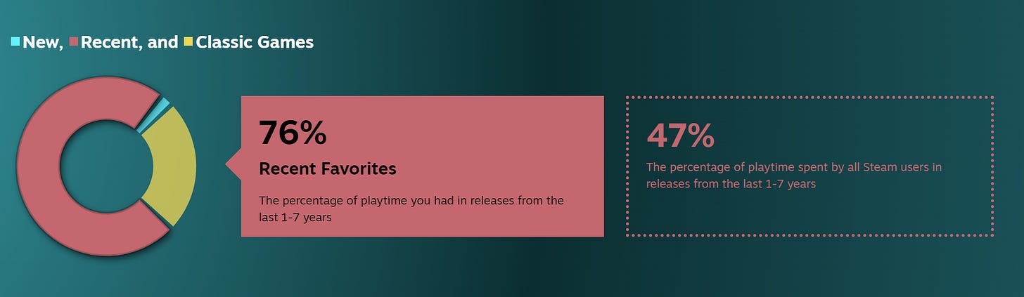 As part of the custom Replay, one of the charts shows your break down by how much time you spent on new releases (games released in 2024), recent releases (released within 1-7 years), and classic games (releases from 8 or more years ago).