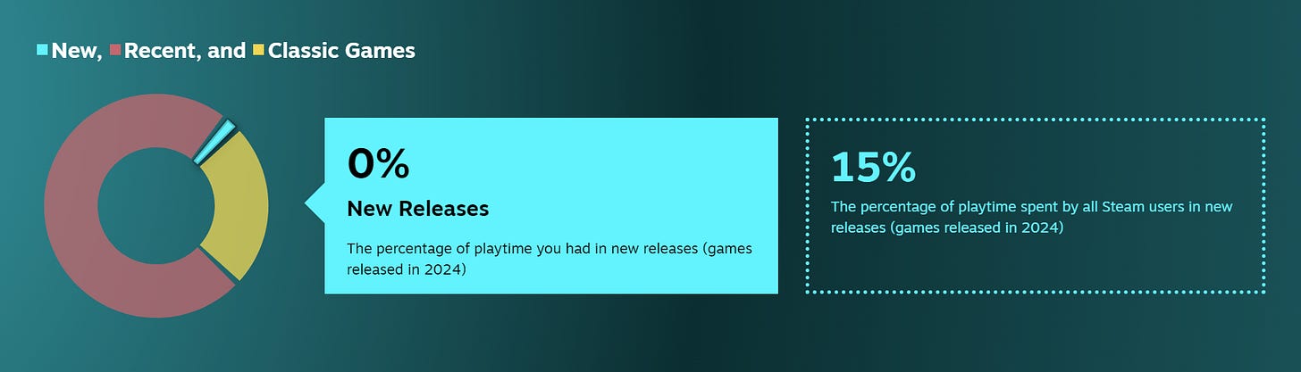 Steam’s Replay 2024, which was previously called Year in Review, revealed that just 15% of total playtime across the entire service was spent on new releases.
