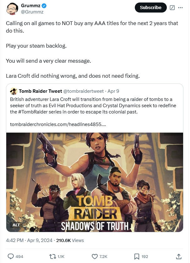 He added, “Lara Croft did nothing wrong, and does not need fixing.”