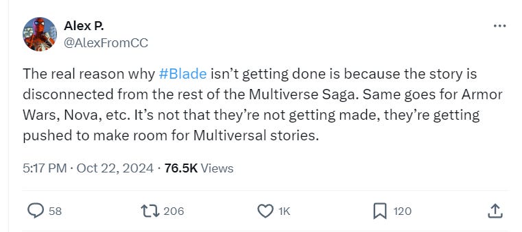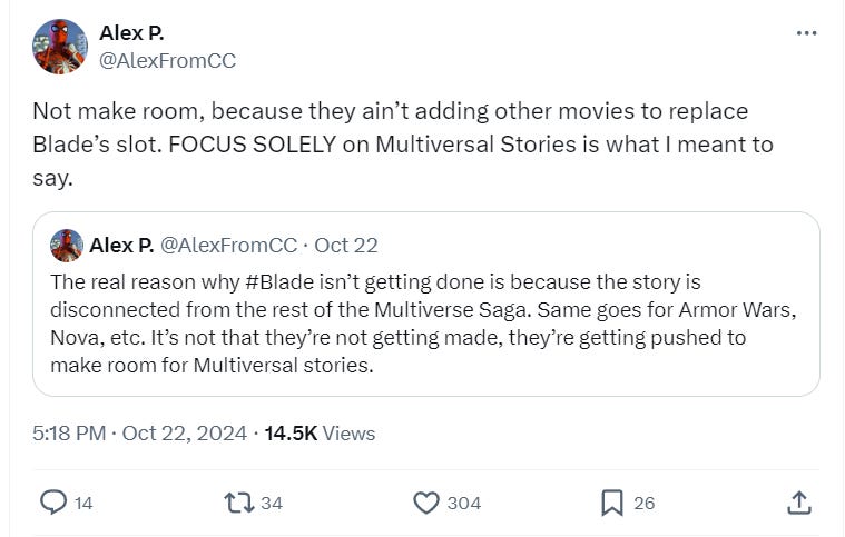 He clarified in a subsequent post, “Not make room, because they ain’t adding other movies to replace Blade’s slot. FOCUS SOLELY on Multiversal Stories is what I meant to say.”