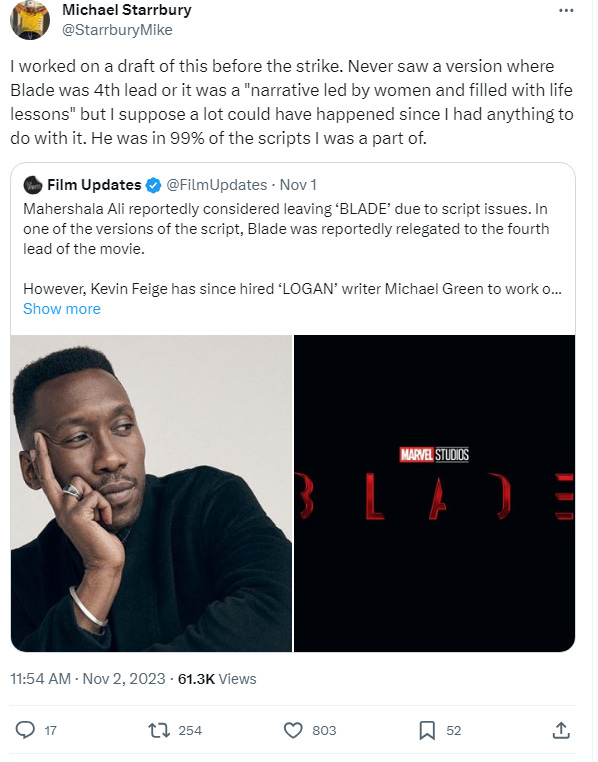 However, these claims were refuted by Michael Starburry, who also worked on the script. He wrote on X, “I worked on a draft of this before the strike. Never saw a version where Blade was 4th lead or it was a ‘narrative led by women and filled with life lessons’ but I suppose a lot could have happened since I had anything to do with it.”