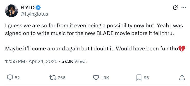 In a post to X, Ellison wrote, “I guess we are so far from it even being a possibility now but. Yeah I was signed on to write music for the new BLADE movie before it fell thru.”