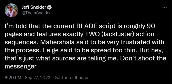 Then in September 2022 it was reported by scooper Jeff Sneider that things were not peachy with the film, “I’m told that the current BLADE script is roughly 90 pages and features exactly TWO (lackluster) action sequences.”