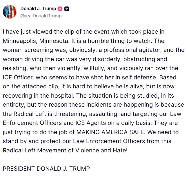 After an ICE officer shot and killed Renee Nicole Good after she attempted to run him over with her vehicle, President Trump reacted to the shooting writing on Truth Social, “I have just viewed the clip of the event which took place in Minneapolis, Minnesota. It is a horrible thing to watch. The woman screaming was, obviously, a professional agitator, and the woman driving the car was very disorderly, obstructing and resisting, who then violently, willfully, and viciously ran over the ICE Officer, who seems to have shot her in self defense.”