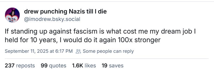 She wrote on Blue Sky, “If standing up against fascism is what cost me my dream job I held for 10 years, I would do it again 100x stronger”