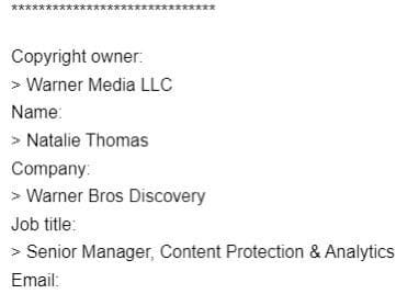 Internet sleuth and Youtuber Hypnotic posted what appears to be confirmation of the leak in the form of DMCA complaints about people posting the image from Warner Bros. Discovery. The takedown is credited to Natalie Thomas, who’s listed as a Senior Manager of Content Protection and Analytics.