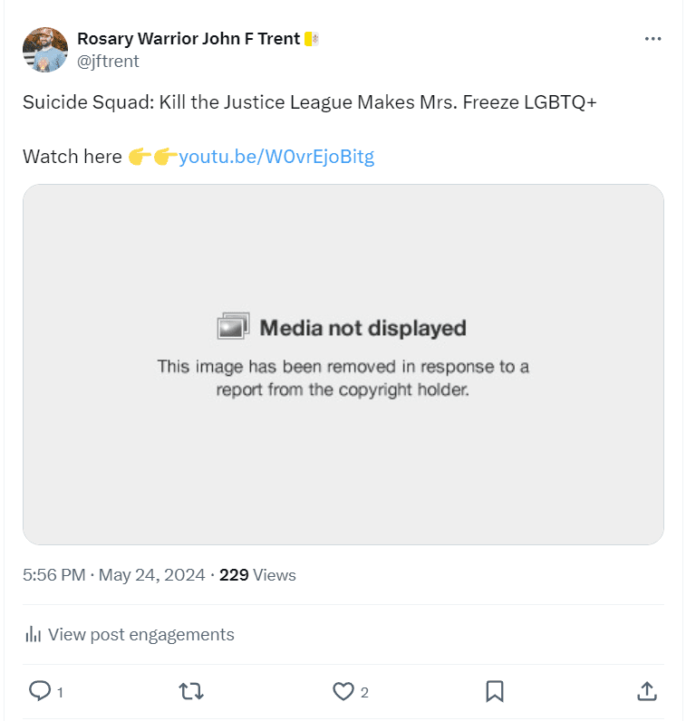 It’s gone so far that YouTuber John Trent had his transformative YouTube thumbnail taken down on X just because it contained the Suicide Squad: Kill The Justice League Mrs. Freeze image within the thumbnail.