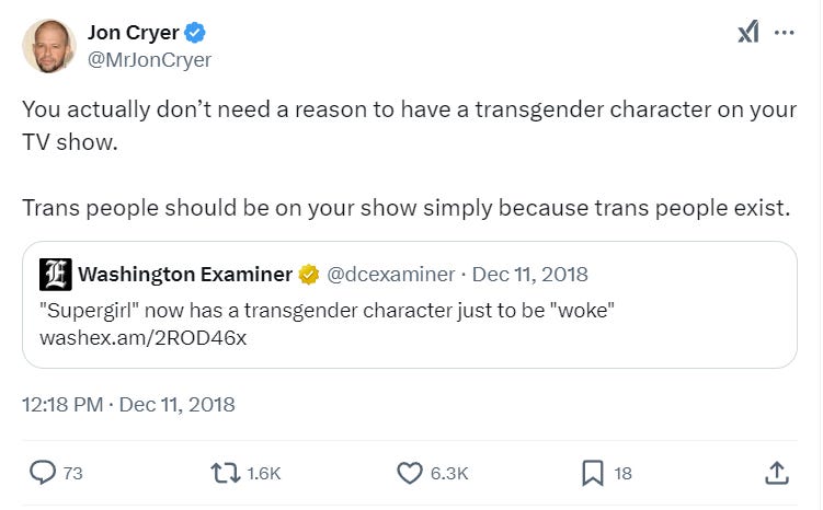 Cryer’s comments are not out of the ordinary for him. Back in 2018, he stated, “You actually don’t need a reason to have a transgender character on your TV show. Trans people should be on your show simply because trans people exist.”