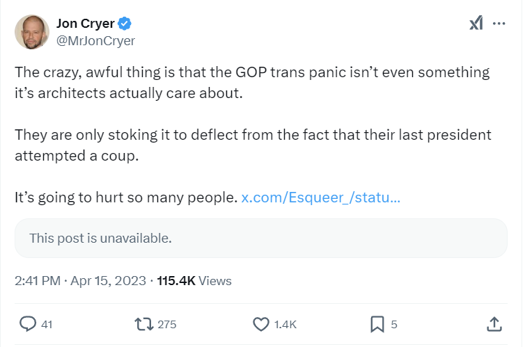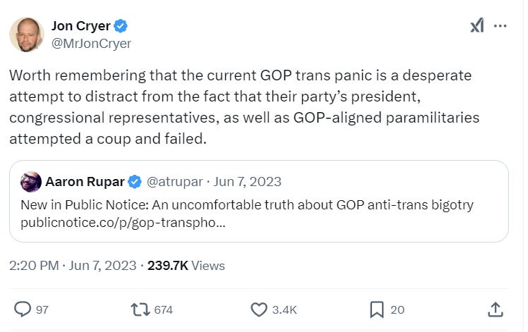 Cryer also shared his belief that the Republican party and Donald Trump attempted a coup. He wrote in 2023, “Worth remembering that the current GOP trans panic is a desperate attempt to distract from the fact that their party’s president, congressional representatives, as well as GOP-aligned paramilitaries attempted a coup and failed.”