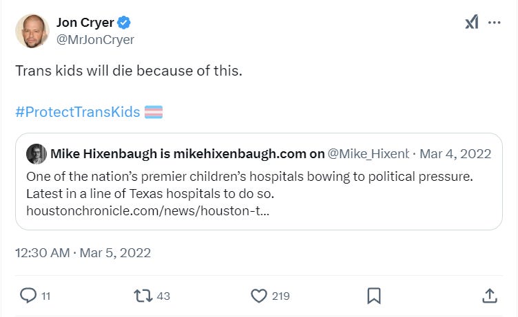 He also claimed in 2022, that so-called “trans kids” would die after a Texas hospital stopped providing hormone therapies to children.