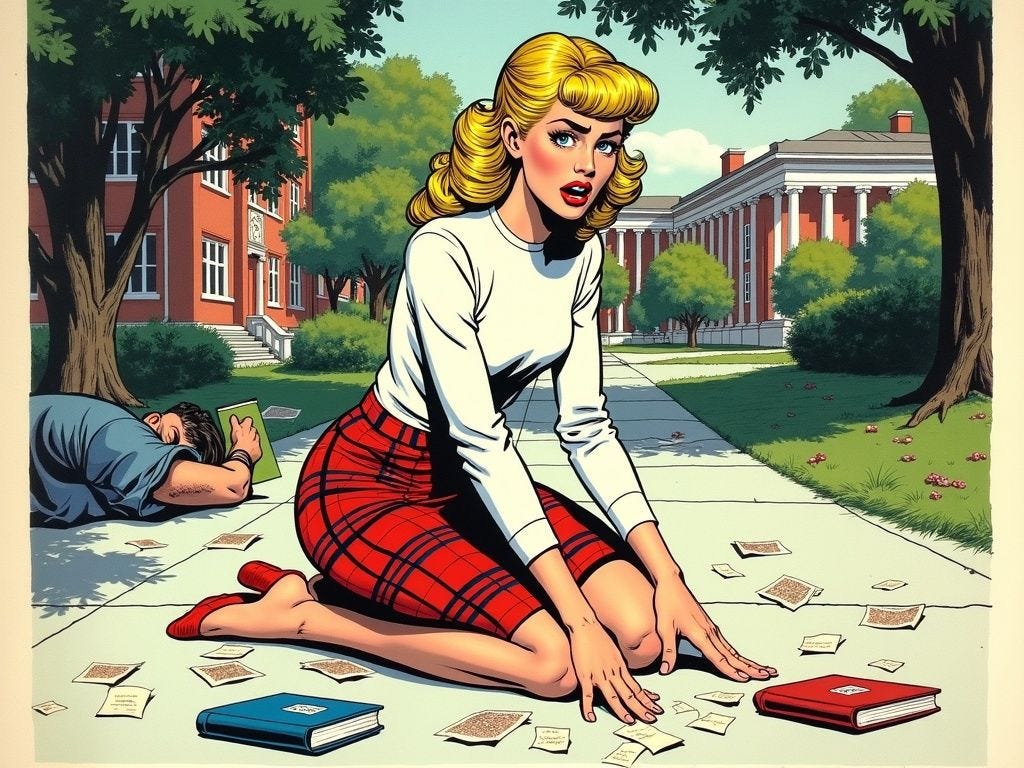 Daphne Woods is a freshman at Evans State College in Broadton, New York in the mid-1960s. On her first day of classes, she’s walking on campus and notices someone who has slipped and fallen. She rushes to help her. As she assists, wind kicks up strewn paper and she lunges to grab it. In doing so, she trips a passing student, who falls into another, starting a chain reaction of pratfalls and culminating in someone dumping food on the prized car of the upperclassman jock, infuriating him. Daphne brightly blushes.