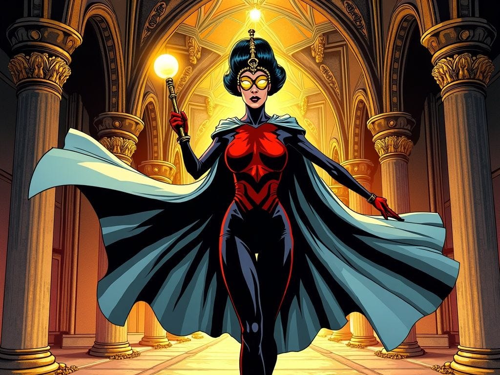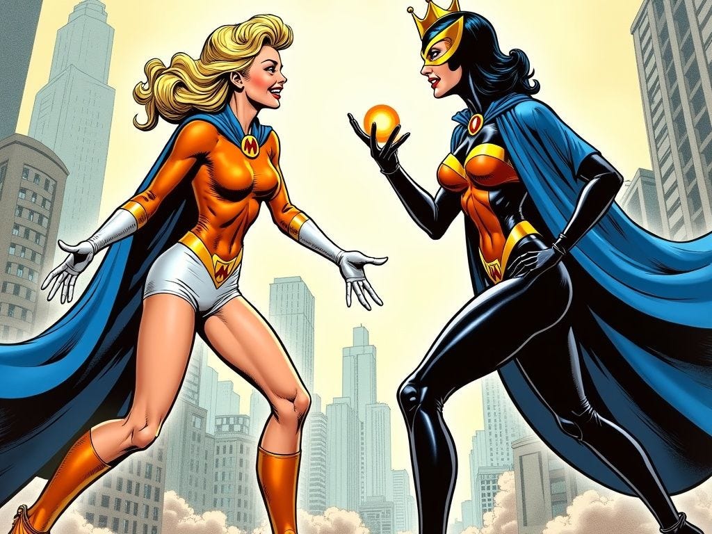 Queen Janine takes the bait, but is surprised to find Magnifi-Girl with Rock, with the superheroine repeatedly disrupting her attacks through her maladroitness. To make matters worse, Magnifi-Girl rebuffs Queen Janine’s calls to switch sides and join her. Rock watches with amusement as Magnifi-Girl’s perky awkwardness leads her to victory. Queen Janine melts down into impotent fury at being defeated by sheer ineptitude. Rock congratulates Magnifi-Girl and offers her a deal.