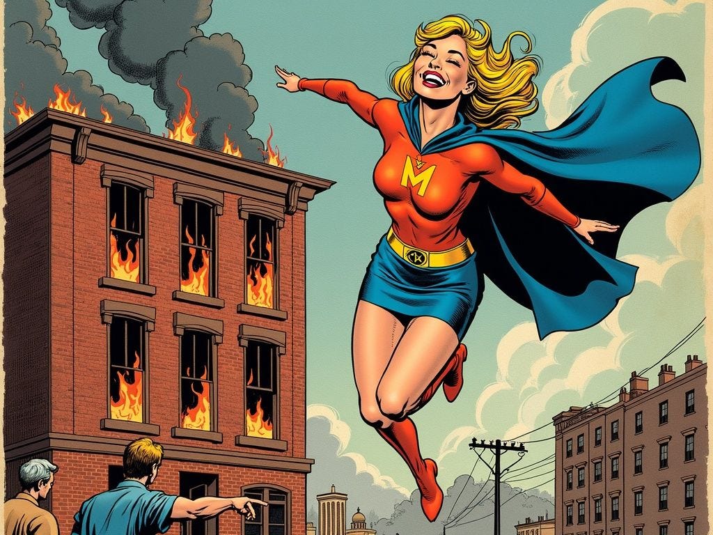 The peppy superheroine uses her super strength to punch away brick walls of the adjacent building’s ground floor until a loss of structural integrity causes it to collapse. She returns to the incident commander with an enormous smile on her face and boasts about her feat. The incident commander looks at her while other firemen surround him with another hose. “We had another hose on the way,” he replies. She apologizes and inquires as to how it started. He mentions that a supervillainess named Queen Janine has taken credit for it. The block of buildings belong to James Rock, whom Queen Janine has denounced as being arrogant and a menace to the city.