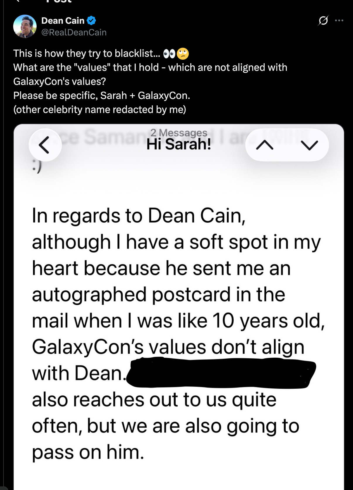 “This is how they try to blacklist… What are the ‘values’ that I hold – which are not aligned with GalaxyCon’s values? Please be specific, Sarah + GalaxyCon,” Cain wrote, calling out the convention’s refusal to articulate their objections.