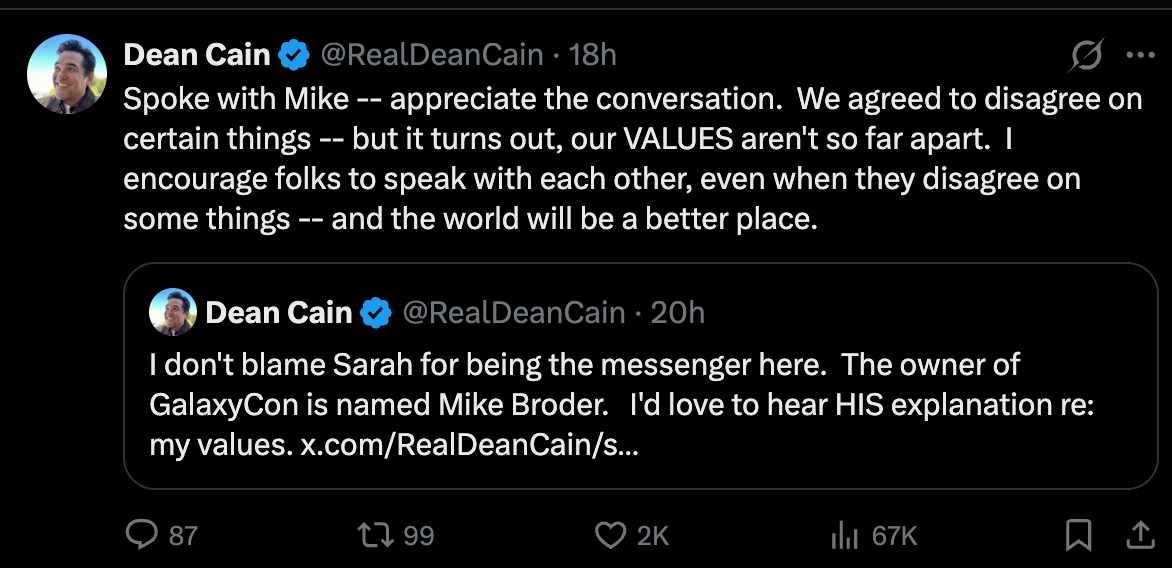 Following the public exchange, Cain confirmed he spoke with GalaxyCon representatives: “Spoke with Mike — appreciate the conversation. We agreed to disagree on certain things — but it turns out, our VALUES aren’t so far apart. I encourage folks to speak with each other, even when they disagree on some things — and the world will be a better place.”