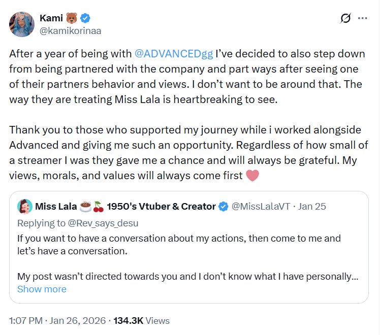 Cosplayer and Twitch streamer Kami wrote, “After a year of being with Advanced GG I’ve decided to also step down from being partnered with the company and part ways after seeing one of their partners behavior and views. I don’t want to be around that. The way they are treating Miss Lala is heartbreaking to see.”