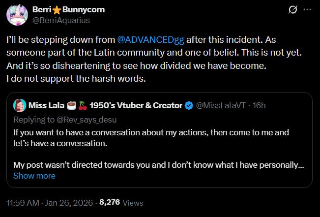 Twitch streamer Berri Bunnycorn, who has since locked her X account, also posted, “I’ll be stepping down from Advanced GG after this incident. As someone part of the Latin community and one of belief. This is not yet. And it’s so disheartening to see how divided we have become. I do not support the harsh words.”