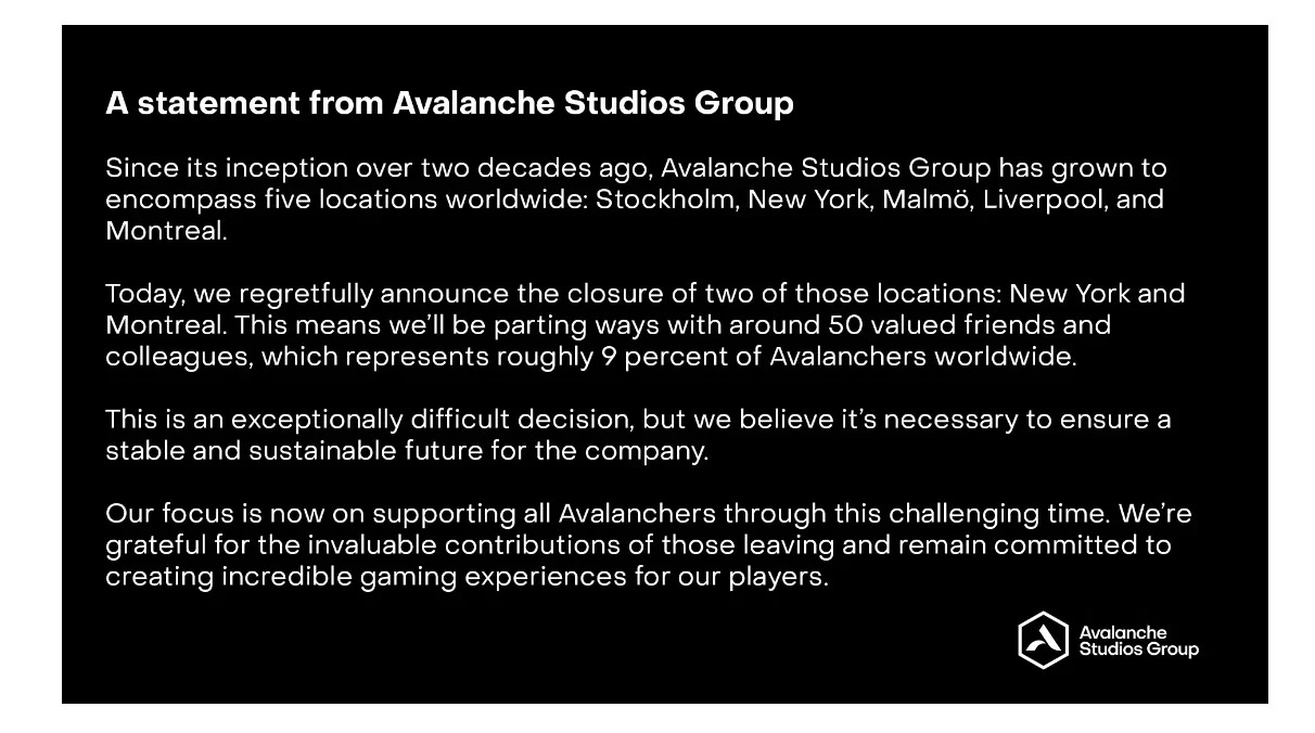 The statement continued, “This is an exceptionally difficult decision, but we believe it’s necessary to ensure a stable and sustainable future for the company. Our focus is now on supporting all Avalanchers through this challenging time. We’re grateful for the invaluable contributions of those leaving and remain committed to creating incredible gaming experiences for our players.”