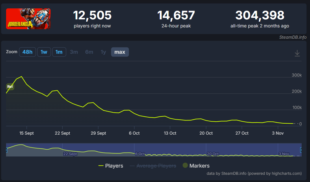 Borderlands 4 hit a peak concurrent player count of 304,398 when it released on Steam back in September. That peak concurrent has declined to 14,657 in the most recent 24 hours.