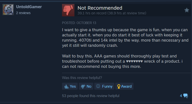 One user wrote, “"It’s so unfortunate that this gem of a game is drowning in performance issues. Randy says it’s our hardware but even the 50 series are struggling with this game. AAA developers. Give me unreal engine 4 on ultra graphics with steady frames instead of a UE5 powerpoint on low settings. Also AI frame generation is a joke unless you like input delay.”