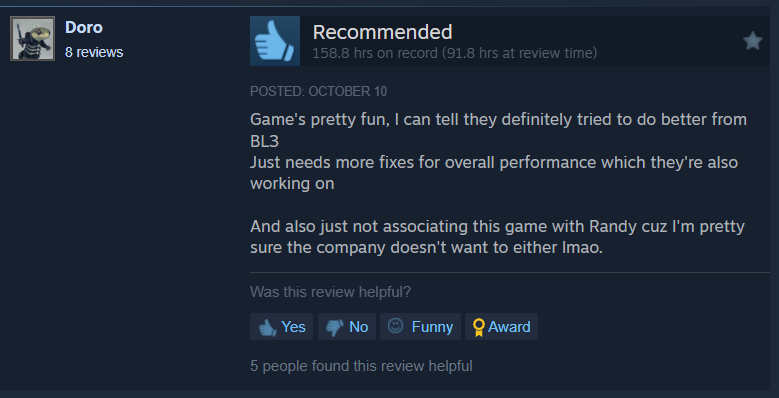 A positive review also mentioned performance issues, “Game’s pretty fun, I can tell they definitely tried to do better from BL3. Just needs more fixes for overall performance which they’re also working on. And also just not associating this game with Randy cuz I’m pretty sure the company doesn’t want to either lmao.”