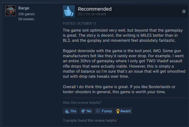 Another reviewed, “The game isnt optimized very well, but beyond that the gameplay is great. The story is decent, the writing is MILES better than in BL3, and the gunplay and movement feel absolutely fantastic.