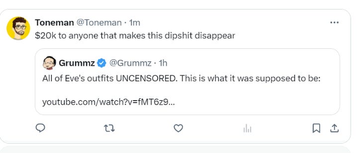 Denims upped the bounty in a stream saying, “Look, I’ll up the number, okay. $30k to anyone who will make this dips**t disappear and make Eve’s breasts bigger. Like you have to do both. Alright. ‘Cause then it’s a win-win for me. I get more breasts and I don’t have to see that moron on my timeline anymore. So if you think about it.”
