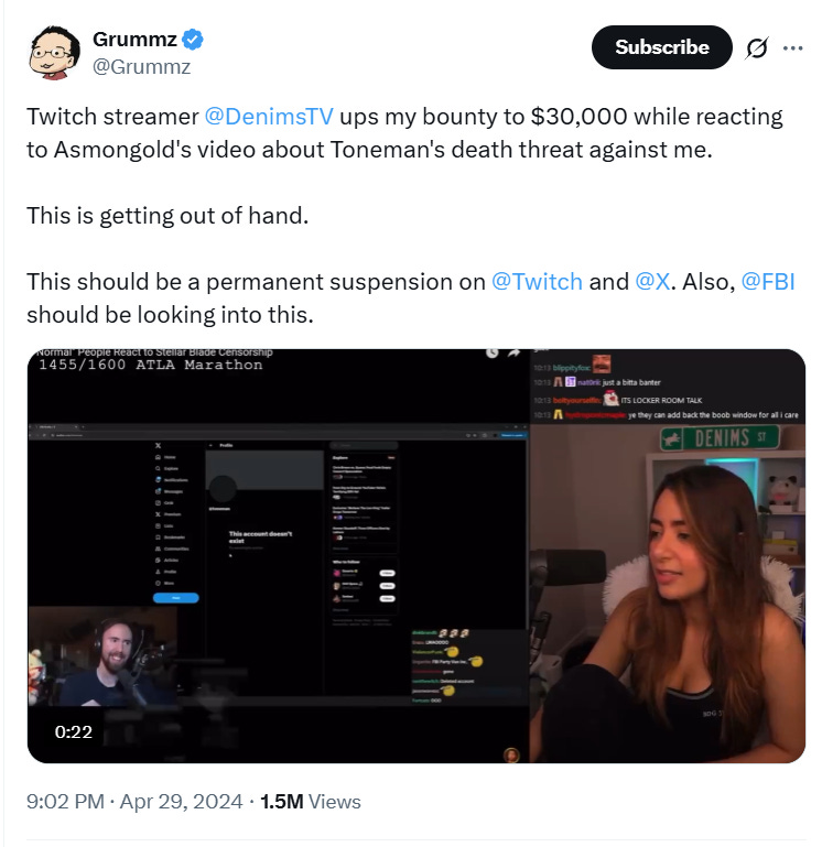X user Toneman originally put a bounty on Grummz writing in now a deleted post, “20k to anyone that makes this dips**t disappear.”