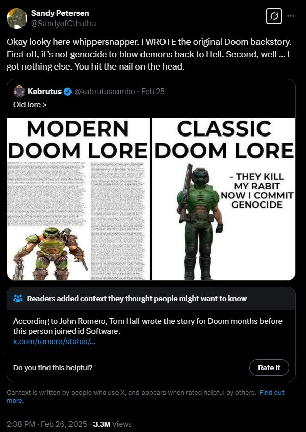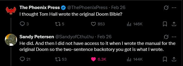 Last week, Sandy Petersen quoted a post from Kabrutus saying he was the one who actually ‘wrote the original DOOM backstory’.