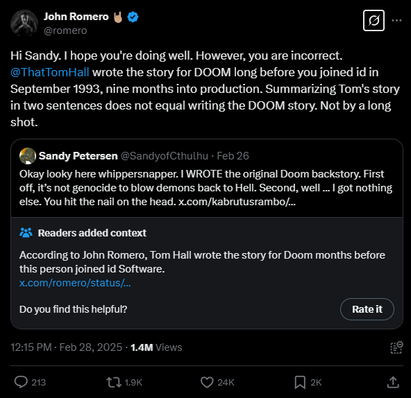 Id Software is one of the most celebrated studios in gaming history. The studio behind Wolfenstein 3D, DOOM and Quake has delighted gamers for over 30 years, and shows no signs of stopping. DOOM: The Dark Ages is set to be released on May 13 this year. Every game studio has its share of politics and social friction, and id Software is no stranger to controversy. One example of this is the feud between the legendary John Romero, one of id Software’s founders, and game designer Sandy Petersen, who was hired by John himself as a level designer. Last week saw a new chapter in this confrontation. Here’s the full story for those wondering what’s behind the drama.