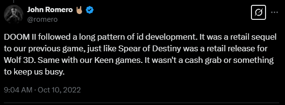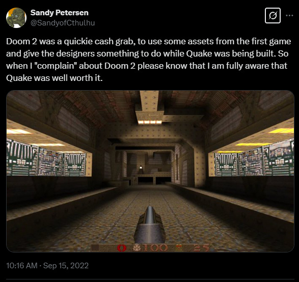 It all started in September 2022 when Sandy Petersen posted on X that DOOM 2 was a ‘quickie cash grab’ in reference to the game reusing some assets from the first game. Petersen mentions that DOOM 2 was apparently given to designers as ‘something to do while Quake was being built’.