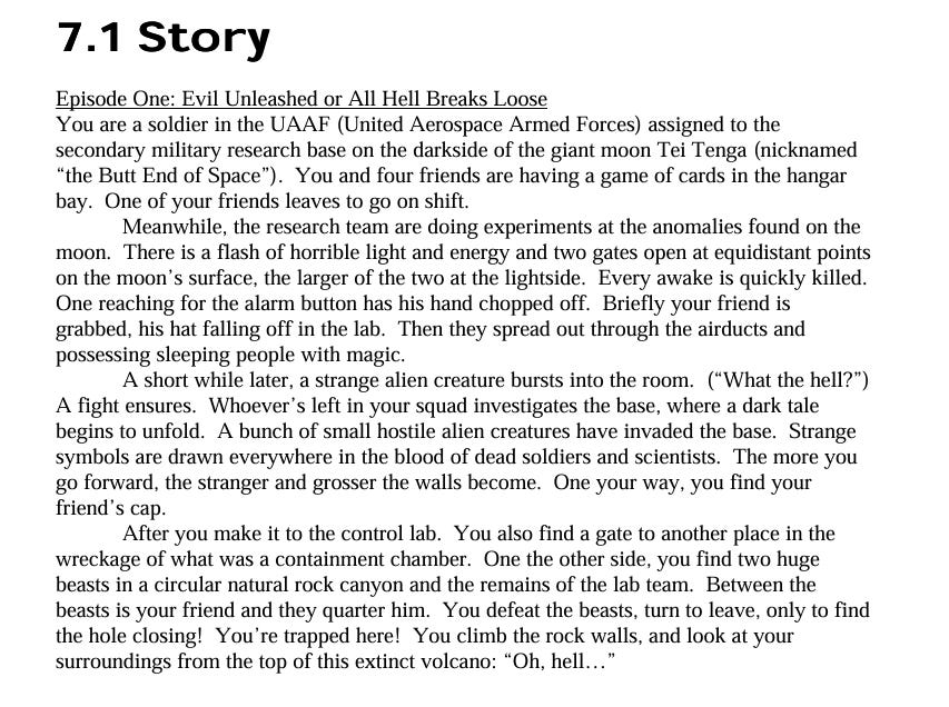 Hall wrote what is known as the DOOM Bible, the original design document for the original DOOM. You can consult it here. Tom Hall’s proposal for DOOM’s backstory.