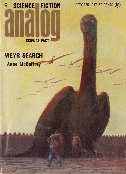 Anne McCaffrey published “Weyr Search” in the October 1967 issue of Analog Science Fiction and Fact, followed by “Dragonrider” in December 1967. These novellas introduced Pern, a lost Earth colony where genetically engineered dragons and their telepathically bonded riders defend against Thread, a deadly spore that falls from the sky in predictable cycles. The stories combined medieval social structures with science fiction underpinnings, creating a unique blend that appealed to both fantasy and SF readers.