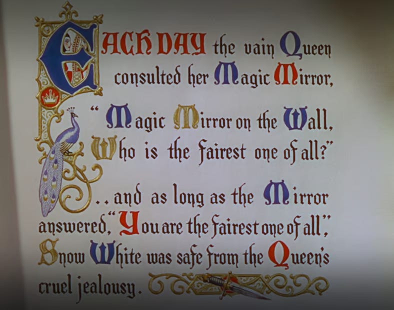 From there, the film provides a description of Snow White when the Queen asks the Magic Mirror the above question. It answers, “Famed is thy beauty, Majesty. But hold, a lovely maid I see. Rags cannot hide her gentle grace. Alas, she is more fair than thee.”