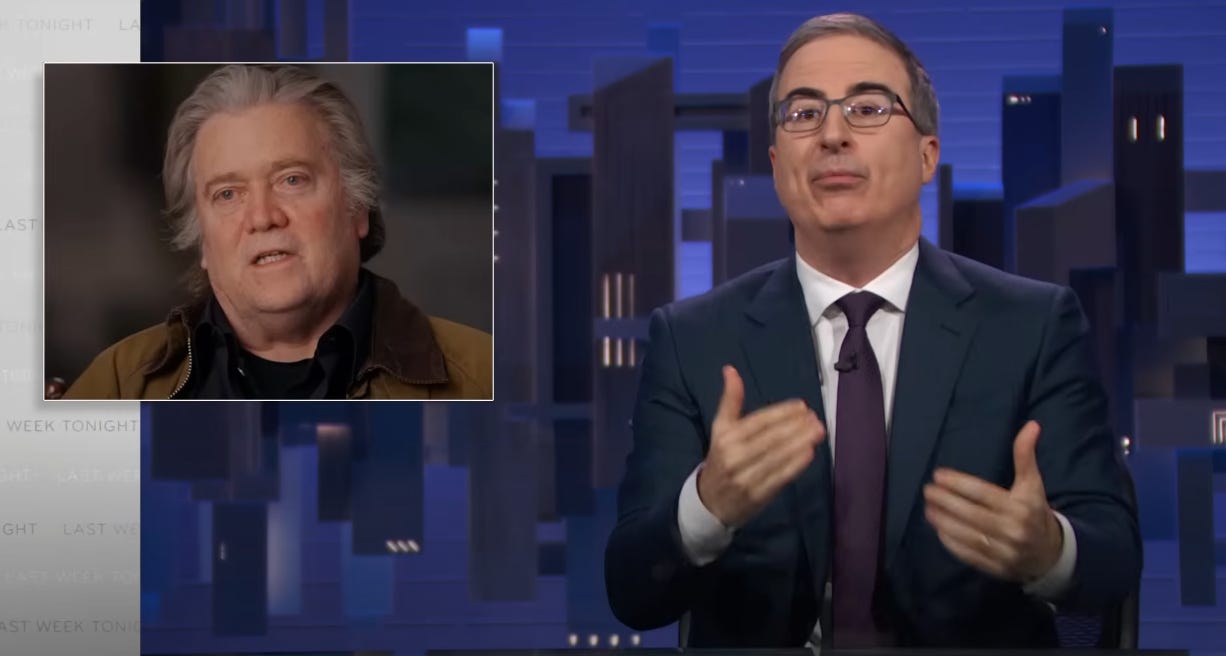 Elsewhere in his opening monologue, the most hilarious part was Oliver unwittingly confirming comments from Steve Bannon that he played.