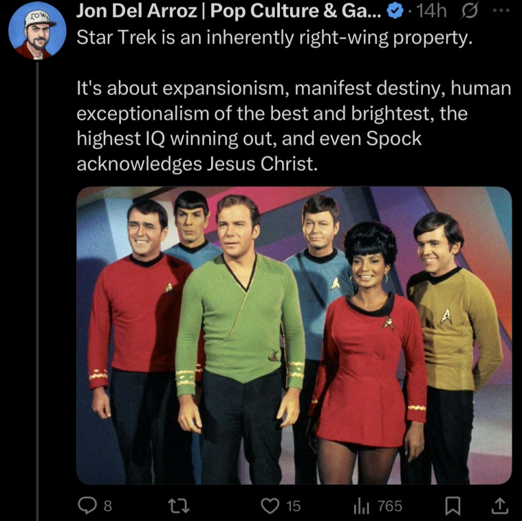 I miss the Star Trek that looked at philosophical issues deeper than: “Is diversity good or plus good?”