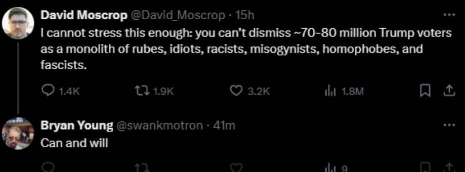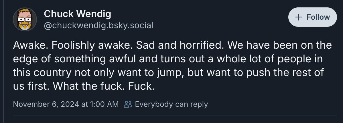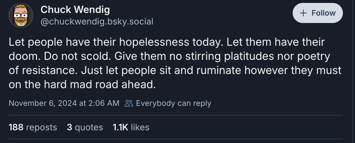 He posted a full blog on the topic, reposting dozens of angry people’s shock to BlueSky, but his own words were certainly ridiculous enough, “Let people have their hopelessness today. Let them have their doom. Do not scold. Give them no stirring platitudes nor poetry of resistance. Just let people sit and ruminate however they must on the hard mad road ahead.”