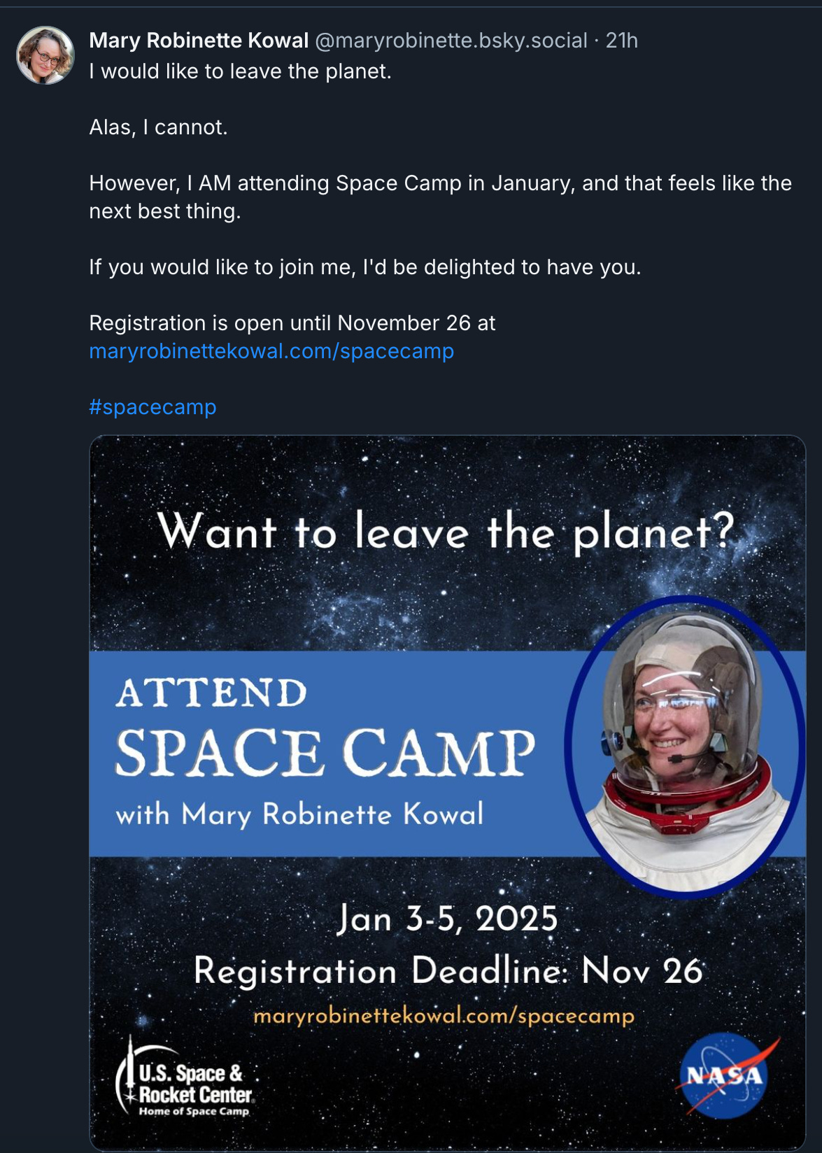 Mary Robinette Kowal, former president of SFWA, feminist icon of the grifting elite used a promotional post for some space camp thing she’s involved with to say she wants to leave the planet over the election.