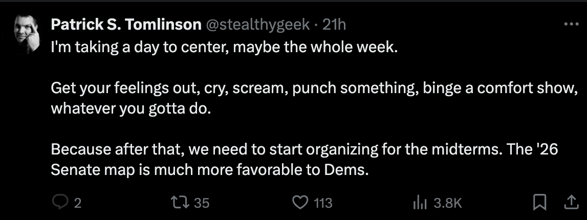 Alleged sci-fi writer Patrick S. Tomlinson, who also has been accused of grinding up black children into pepperoni in his basement in Milwaukee, posted so much it’s hard to curate the best of them. He’s very upset to say the least, given this post, “I'm taking a day to center, maybe the whole week. Get your feelings out, cry, scream, punch something, binge a comfort show, whatever you gotta do. Because after that, we need to start organizing for the midterms. The '26 Senate map is much more favorable to Dems.”