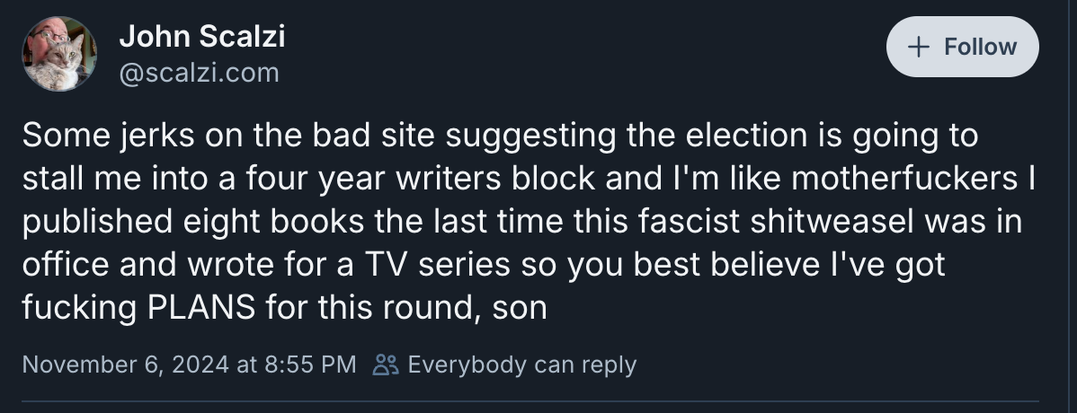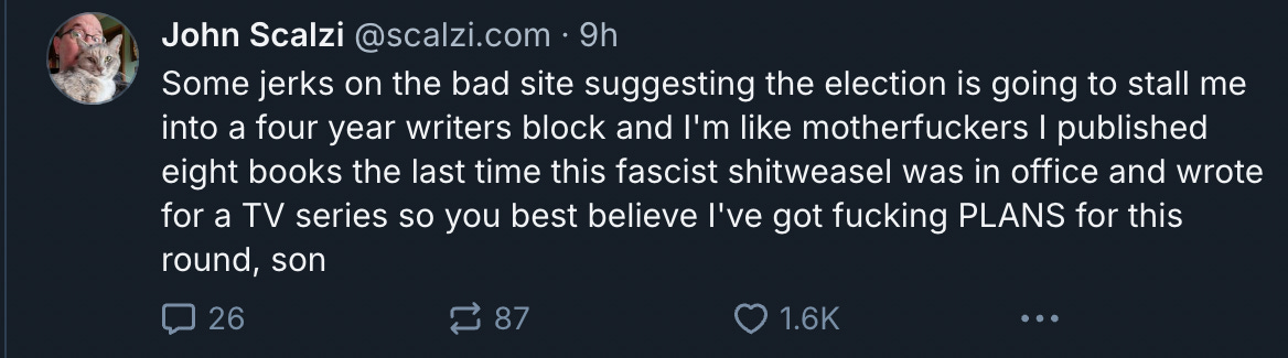 He apparently forgot about his inability to write as well, as he was called on it on X by sci-fi fans and authors who remembered, to which he passive-aggressively responded on BlueSky, “Some jerks on the bad site suggesting the election is going to stall me into a four year writers block and I'm like motherfuckers I published eight books the last time this fascist shitweasel was in office and wrote for a TV series so you best believe I've got fucking PLANS for this round, son”