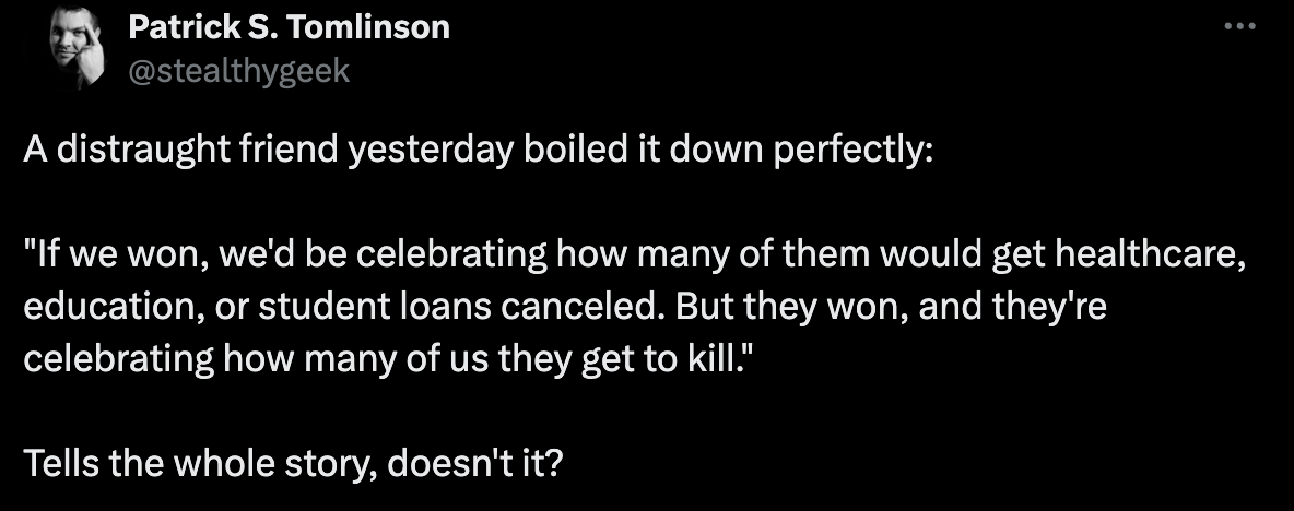 And he literally thinks Trump supporters are going to kill him, “A distraught friend yesterday boiled it down perfectly: "If we won, we'd be celebrating how many of them would get healthcare, education, or student loans canceled. But they won, and they're celebrating how many of us they get to kill." Tells the whole story, doesn't it?”