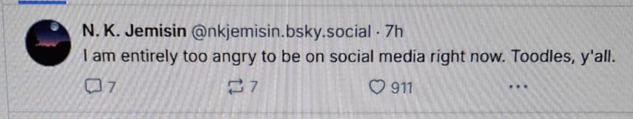 She said, “I am entirely too angry to be on social media right now. Toodles, y’all.” Brilliant writing deserving of another Hugo Award by itself, surely.