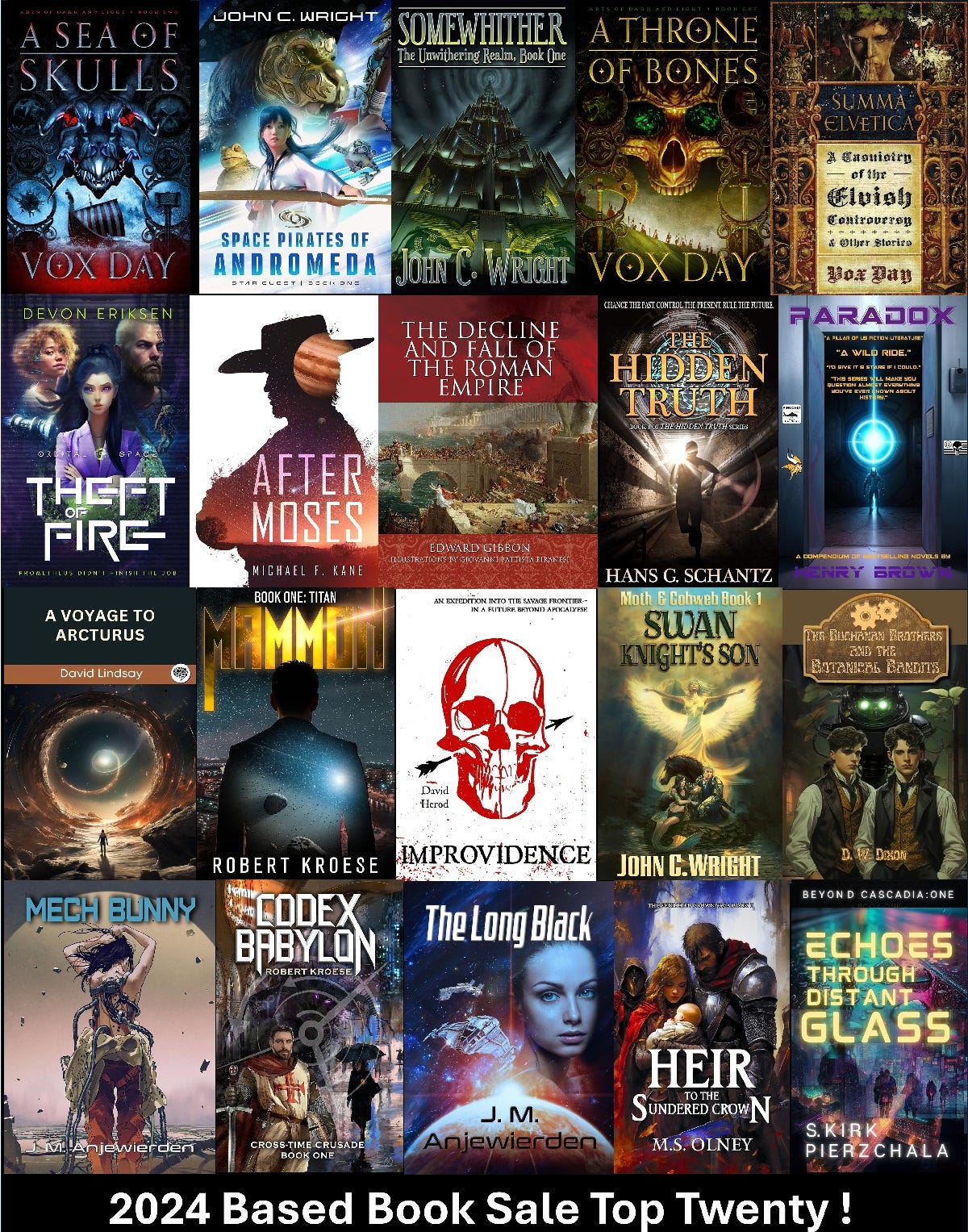 The Based Book Sale has announced the top-based books of 2024. Heading the list are titles by Vox Day, John C. Wright, Devon Eriksen, and Michael F. Kane. “These were the most popular books readers selected out of a total of more than 5000 sold,” explained the sale organizer, scientist, inventor, and author Hans G. Schantz. “2024 Based Book Sale Top Twenty is a crowd-sourced list of some of the best-based books available, chosen from a list of over two hundred titles entered in the four Based Book Sales in 2024.”