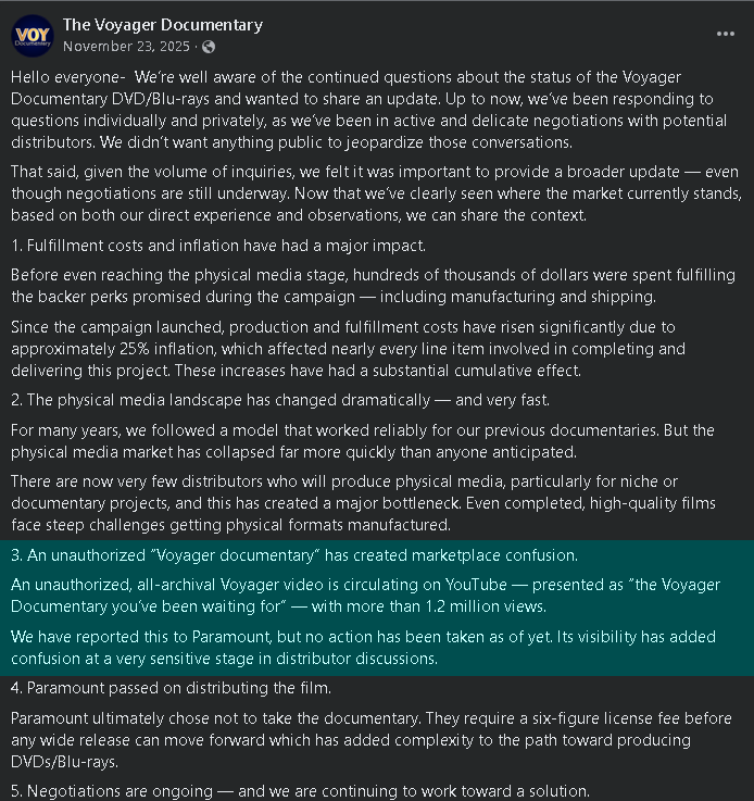 The Voyager Documentary, a crowdfunded commercial project that has been struggling to deliver physical media to backers, posted a lengthy update on November 23, 2025 explaining their distribution difficulties. Buried among legitimate grievances about inflation, fulfillment costs, and the collapsing physical media market was a pointed accusation: