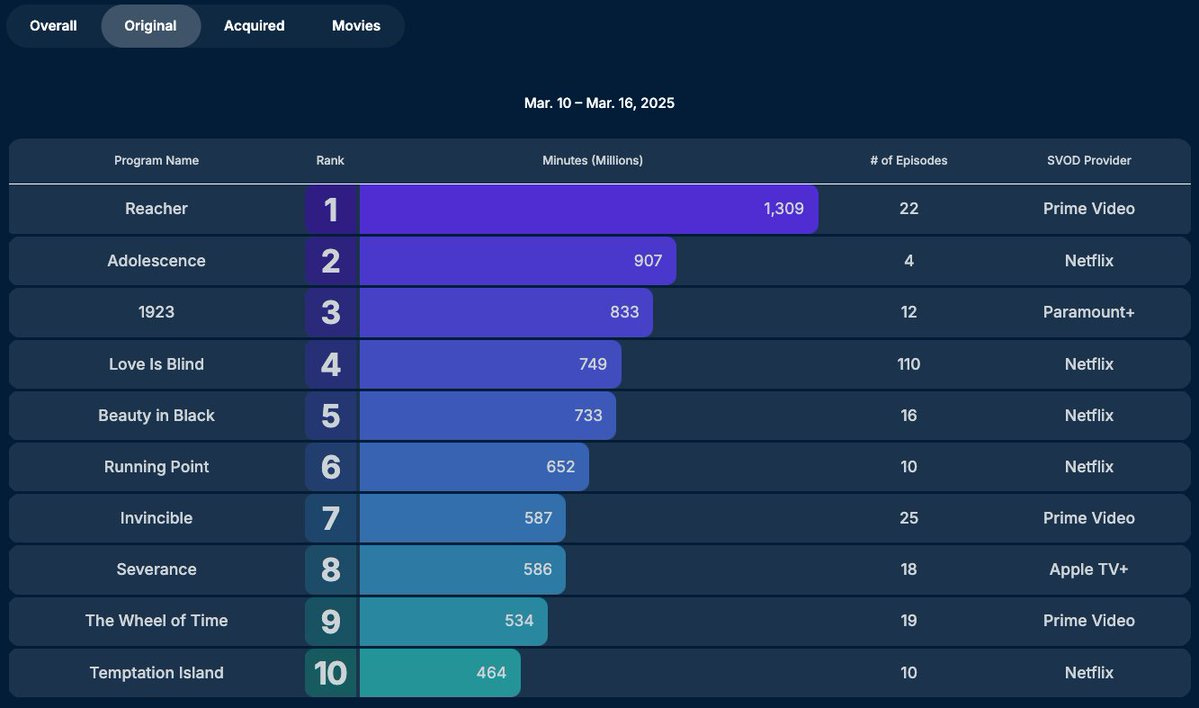 In its second week, it saw total minutes watch increase to 538 million minutes. By its third week it fell to 505 million minutes.